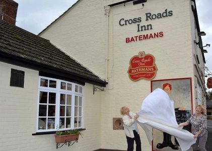 The picture shows Denise and local artist Maureen Marriott unveiling the new information board outside The Crossroads, sporting a picture of ‘Algernon’, a character taken from a figurine that Mike and Denise had in the bar.