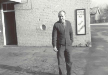 The picture shows Cyril outside The Cross Roads, with the side door that led into a corridor through to the bar area. The overhang can be seen that gave patrons some protection from the weather when they made the trip to the outside toilet.