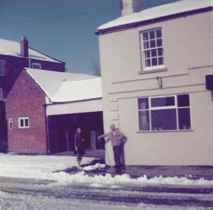 The picture shows the family clearing snow from outside the pub in 1975. In the covered area on the left can be seen the entrance to the outside toilet and store rooms.