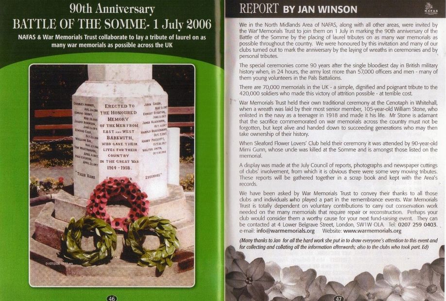 In addition, on the 1st July 2006 a special remembrance service was held at the war memorial to commemorate Somme Day. A photo of the memorial was subsequently used in a magazine article about Somme Day.